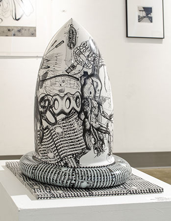 In this recent work I have been exploring different ways of drawing on ceramic forms. Instead of drawing with my own hand, I have been employing decal images of different line qualities from different time periods and different artists to compose and collage my drawings. In a way it is like drawing with someone else’s hands or like conducting a piece of music. In the same manner that musical artists are sampling sounds and music of other artists to reconstruct into their own compositions, I am sampling images to reconstruct into intense, layered, mythological narratives, which have a very different rhythm than flat drawings. Some of the themes that are emerging are Biblical, Mythological and Scientific in nature. I have been exploring the origins of our species, the moral dilemma of good and evil, the role of man in nature, and the interface of science, technology and mythology.