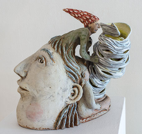 Long ago clay became my primary choice of medium because it is a material that I never tire from. I am a hand builder using the slow and steady process of coil and slab building. I work with the human head and female figure as subject matter because it best communicates the themes that I am interested in, love and companionship, growth and death, balance and the passage of time. Like a perfect cup of tea I mix these ideas together and add just a bit of humor to taste.