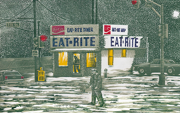 The focus of my work has always been to depict something about the American experience, no matter how ordinary, and to say it in an aesthetic manner. The enjoyment of color, composition and consideration of tactile surfaces all need to marry with the content. That being said, I sometimes will create a piece for its pictorial qualities in and of itself, sometimes for the technical challenge a visual idea may pose. Elements of the way things sound and smell are also meaningful to me. Visual images should bring about the “at onceness” experience that we all know and understand in an instance.