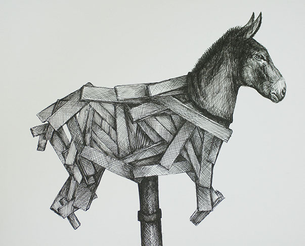 Currently I am exploring through both drawing and ceramics. I look for juxtaposition; elements that should not fit together, but somehow can be made to work together. I have always been fascinated by the forms animals take, and when working in construction while in college, became intrigued by the order and logic of the plumbing and framing techniques used in large buildings. I love that these can be combined and so I do.